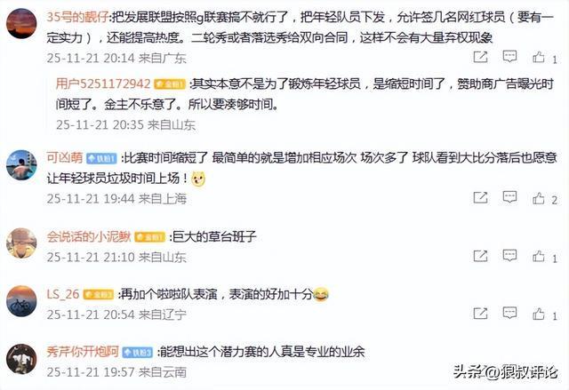 有球迷点评表示:“把发展联盟按照g联赛搞不就行了,把年轻队员下发,允许签几名网红球员(要有一定实力),还能提高热度。二轮秀或者落选秀给双向合同,这样不会有大量弃权现象”。