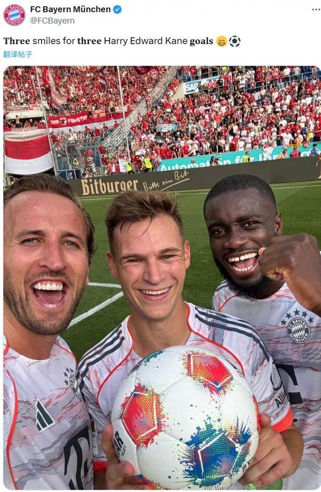 上演帽子戏法,拜仁官推晒凯恩与队友以及比赛用球的合影