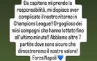 直播吧9月20日讯 那不勒斯队长迪洛伦佐在社媒发文,为自己在欧冠比赛中的红牌道歉。在第1轮欧冠比赛,那不勒斯客场0-2负于曼城。比赛第18分钟,迪洛伦佐在铲球时对哈兰德犯规,被直